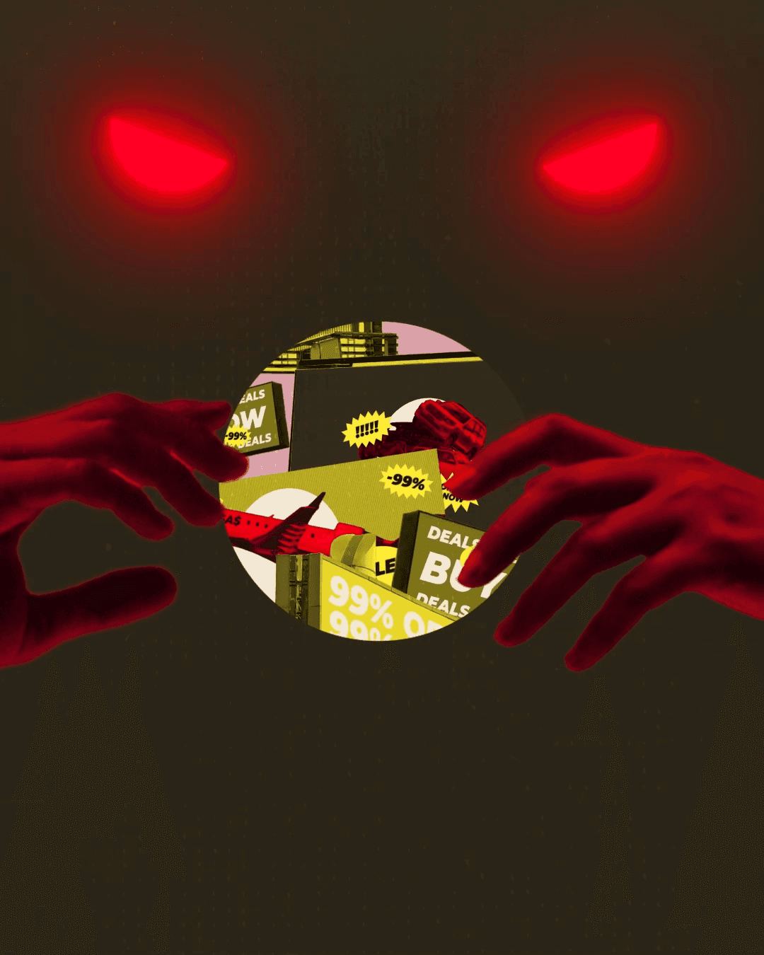 The visual identity takes inspiration from this historical ban. Using a collage aesthetic and warm tones, the style references old-school advertising—but with a twist. One of the primary color is deliberately off-putting, borrowed from cigarette packaging as a subconscious warning. In contrast, bold splash colors, reminiscent of promotional leaflets and bargain flyers, exaggerate the urgency of consumer culture. The overall style is intentionally over the top, carrying a hidden message about overconsumption and its impact.